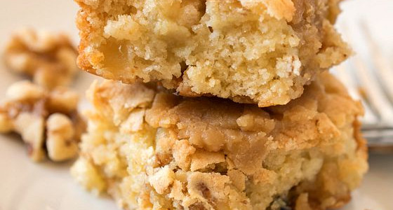 A sweet butter and vanilla batter is mixed in a bowl with chunks of apples and chopped walnuts – then baked. As the bars bake, you’ll mix up a simple glaze with butter and brown sugar, plus some milk.