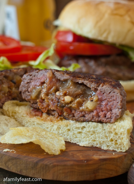 Our version takes some of our favorite toppings – bacon, blue cheese, cheddar cheese and caramelized onions — and turns them into a decadent stuffing for a grilled or pan fried burger! Creating these bacon and blue cheese stuffed burgers is really quite easy to do, plus it’s a fun (and delicious) twist on your standard burger fare!