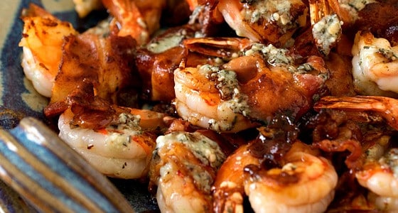 Bacon-Wrapped Gulf Shrimp with Blue Cheese Butter and Port Reduction