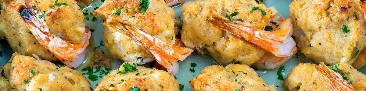 Jumbo, tail-on shrimp are filled with a stuffing made with lump crab meat, a combination of Ritz and Saltine crackers, mayonnaise, clam juice, diced vegetables, plus sherry, butter and other seasonings.
