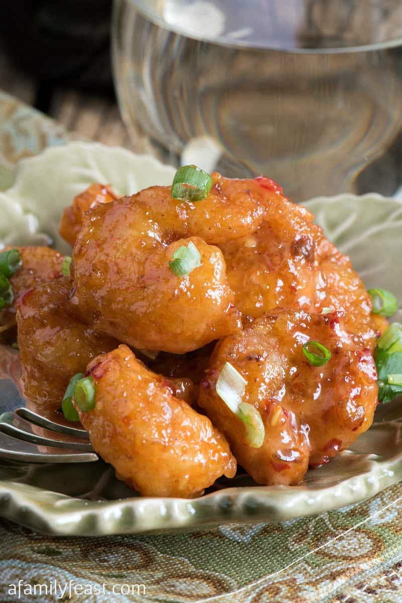 - Once the oil is back to 350 degrees F, cook the second half of the shrimp and toss with the remaining sauce.