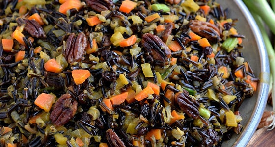 The wild rice is first soaked overnight to soften. Then it’s cooked together with sautéed carrots, onions and celery in a vegetable broth that has been flavored with orange juice and vermouth. Some sweet currants are added to the pot of rice right at the end, and then the whole thing is tossed with some toasted pecans for crunch and some scallions for some bright fresh flavor!
