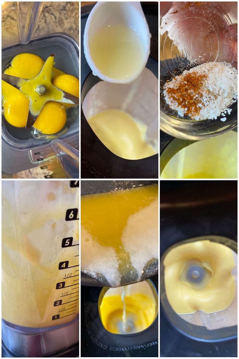 - Blend the egg yolks for 30 seconds on medium speed, then add half the lemon juice along with all of the seasoning and blend for another 30 seconds. With mixer running on low, slowly drizzle in the hot melted butter, blending for another 30 seconds after all of the butter is in. Be sure to include all of the butter – including any milk solids that might have separated as it sat in the pan. Taste and add more lemon juice, salt, pepper or cayenne, if needed.