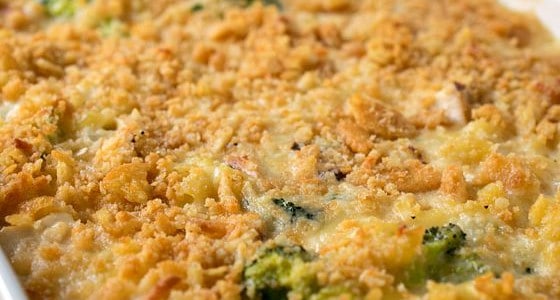 It starts with a light and creamy Alfredo sauce combined with cheese, pasta, tender chunks of chicken and broccoli florets, all mixed together and then placed in a baking dish. The cheesy pasta is covered with buttered Ritz cracker crumbs and more shredded cheese before being placed in the oven to heat until melted and golden brown on top.
