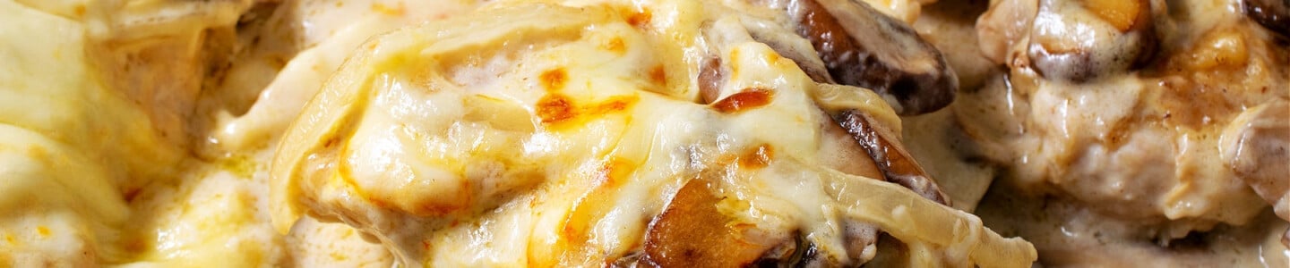 - Pour this mixture over the chicken and mushrooms then top with the Muenster cheese slices.