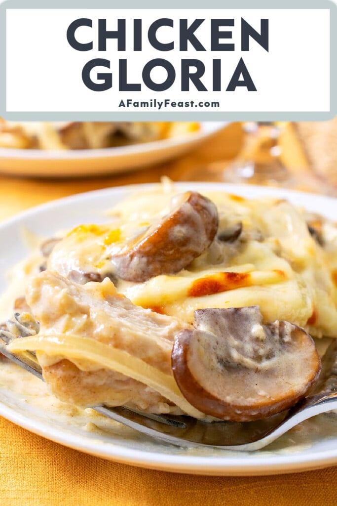 Chicken Gloria has tender chicken, mushrooms, onions, and garlic in a thick and rich sherry cream sauce, then topped with muenster cheese. Baked until hot and melted, this casserole is total comfort food!