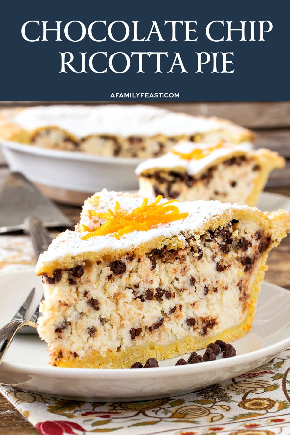 Some families simply refer to this kind of pie as an Easter Pie – but NOT to be confused with this savory Easter Pie. Other families simply call this a ricotta pie (or sweet ricotta pie) – but with no mention of chocolate chips in the filling, it could be easily be confused with this Italian Ricotta Pie.