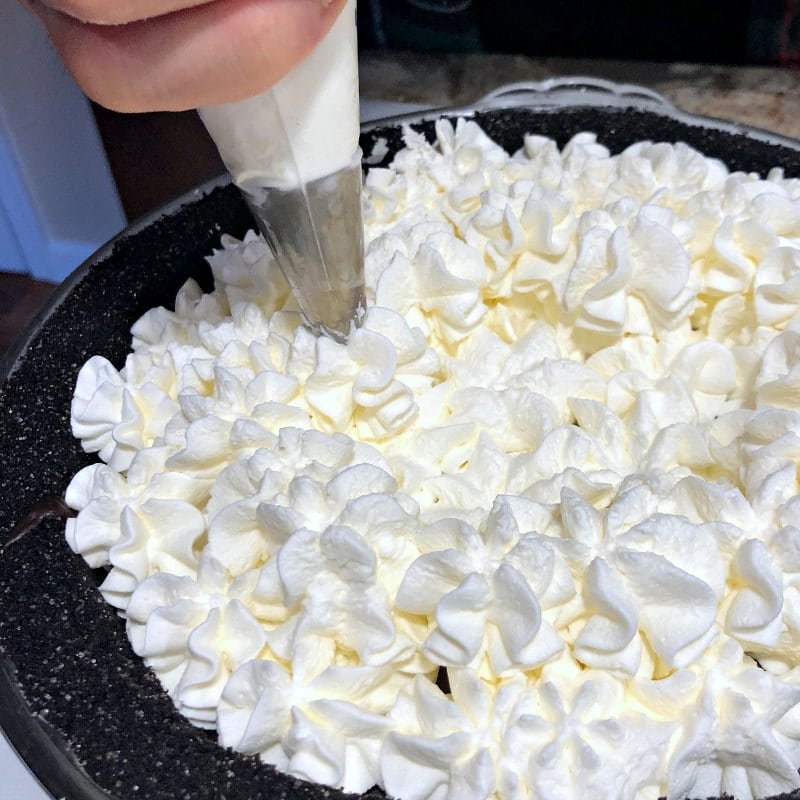 The next day, whip heavy cream with some confectioners’ sugar, then place in a pasty bag fitted with a star tip. Pipe stars over the entire top of your chocolate cream pie. (You can also simply spoon the whipped cream over the top of the pie, if you prefer.) Sprinkle with shaved milk chocolate for decoration.