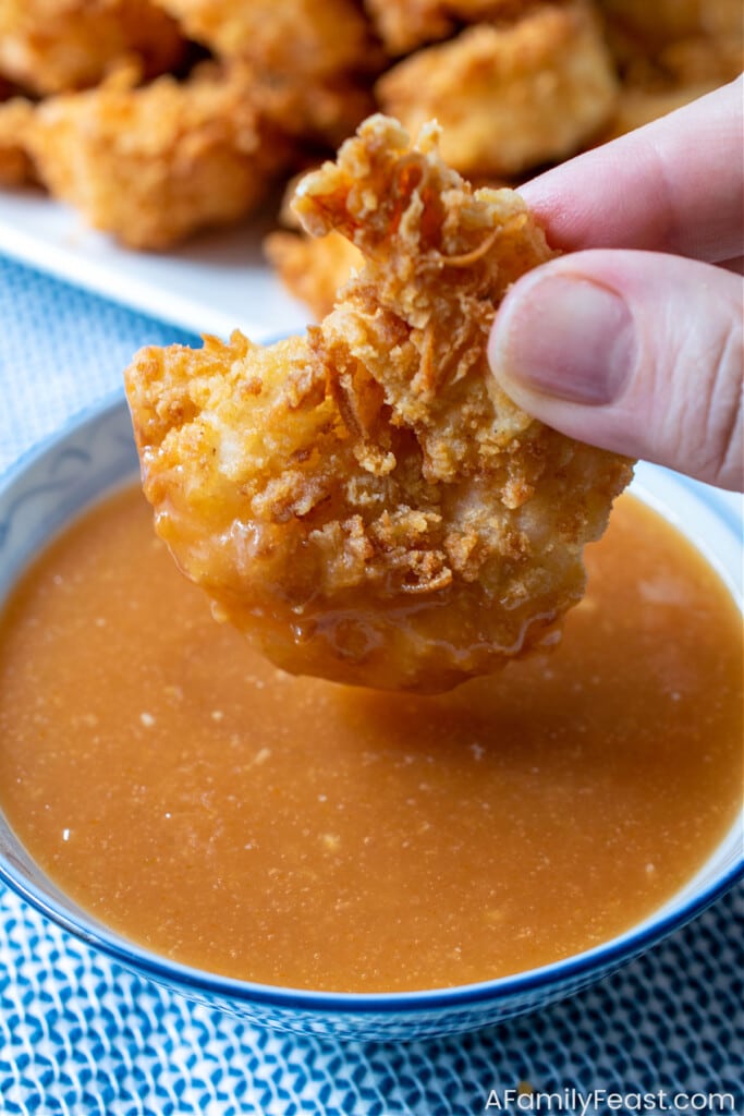 Fry the shrimp until golden brown and crispy, then serve with Sweet Chili Dipping Sauce – the perfect zesty-sweet sauce for this dish.