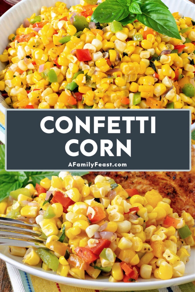 It gets its “confetti” name from a colorful mix of fresh corn kernels combined with a variety of green, red, and orange bell peppers, plus diced red onion. This colorful mixture is sautéed in butter and oil until tender.