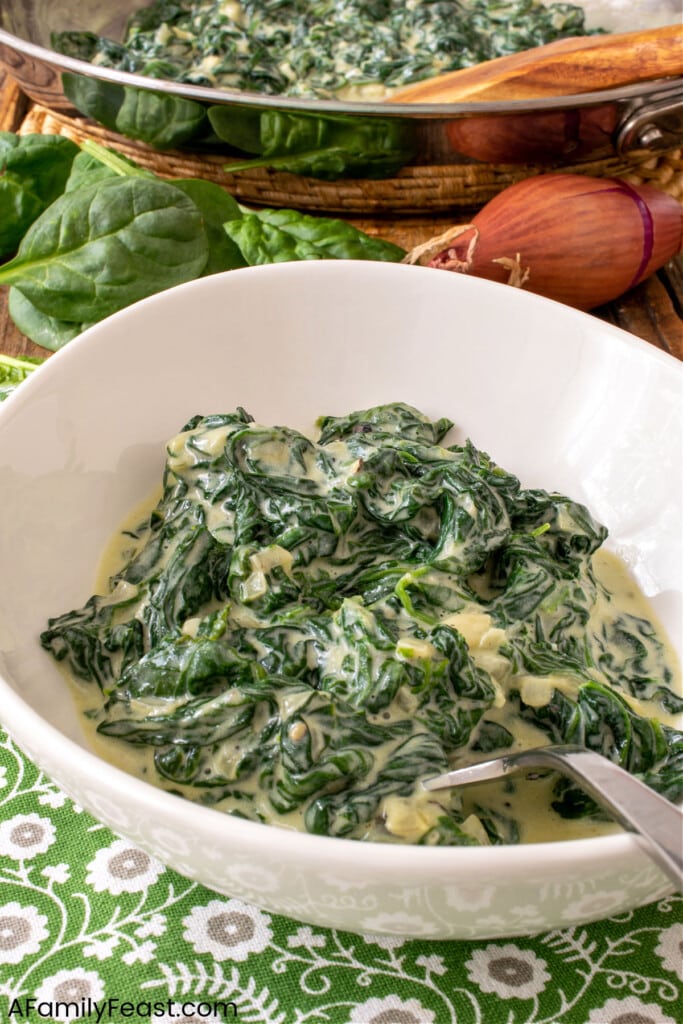 Creamed Spinach is a classic, vegetable side dish that goes with just about any meal. We often serve it for the holidays – with turkey, ham, or prime rib – but it’s also really good at other times of the year with a pan-seared steak, or grilled chicken or pork chops.