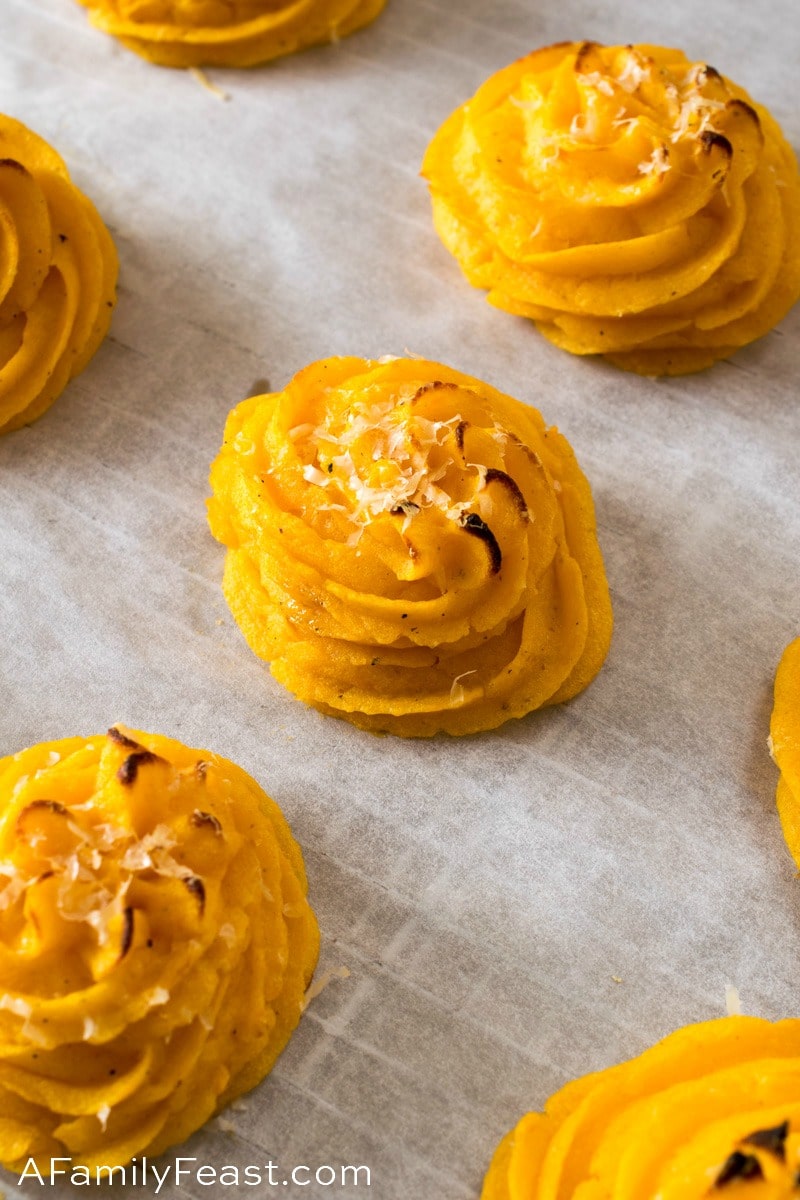 Duchess Sweet Potatoes are made with mashed potatoes that have been piped into a swirled mound, then baked until golden and crispy. A quintessential French side dish!