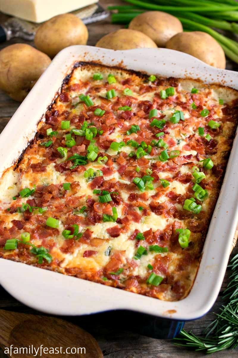Slices of Yukon Gold potatoes are tossed with rendered bacon fat, fresh rosemary and seasonings before being poured into a buttered baking dish. Then, the potatoes are coated with a creamy, cheesy, zesty topping of cheddar cheese, cream cheese, mayonnaise and chopped scallions.