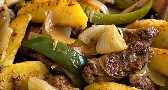 This easy dinner is a classic flavor combination! Sweet Italian sausage and thick slices of sautéed onions and green bell pepper are tossed together in a skillet with wedges of crispy potatoes. The potatoes get some extra flavor (and that wonderful crispy crust) by being sautéed in butter and seasoned with garlic powder, oregano, seasoned salt and paprika.