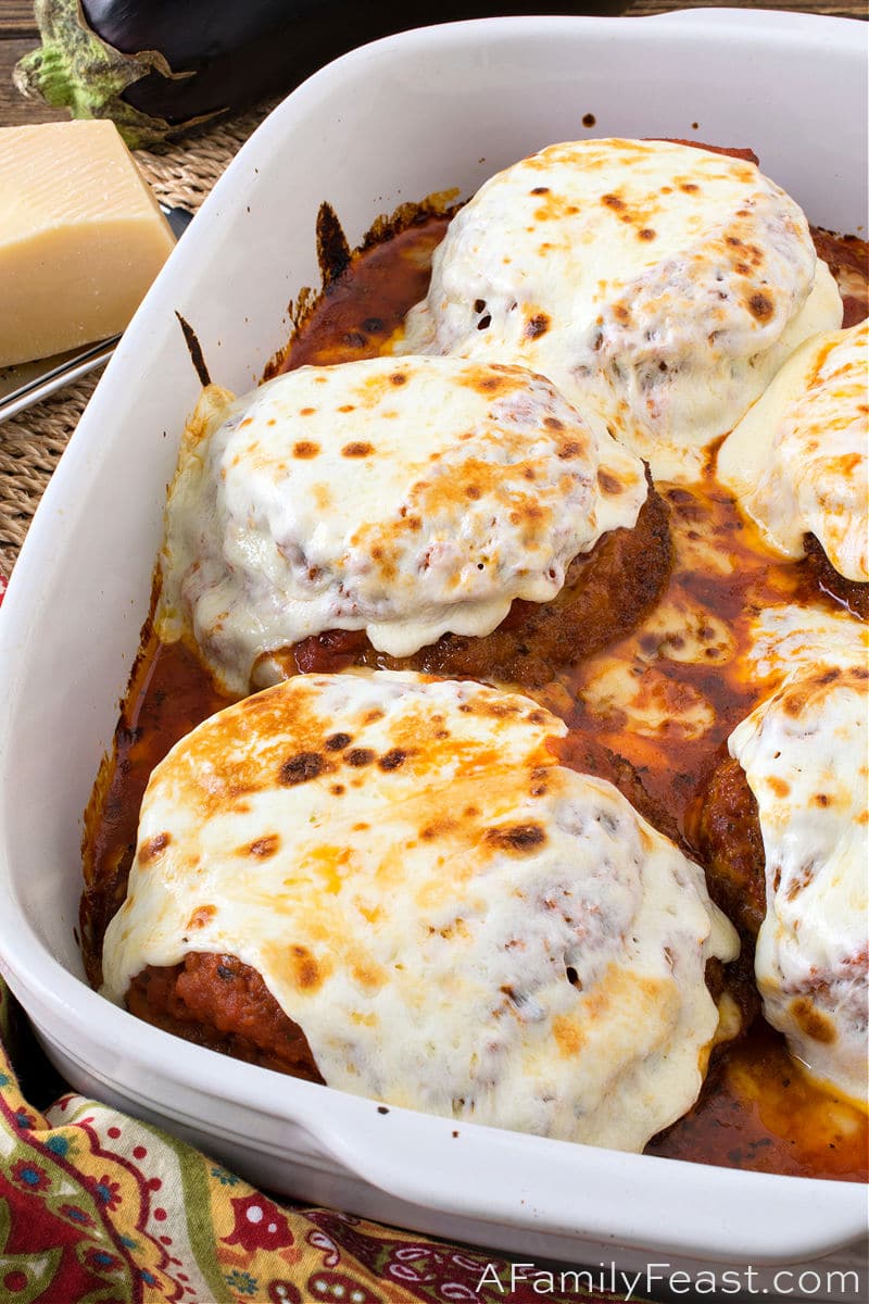 - Can I double this easy Eggplant Parmesan recipe? Yes, but you will need an additional baking dish. We would also recommend two skillets for frying and maybe a kitchen helper to get it assembled quickly.