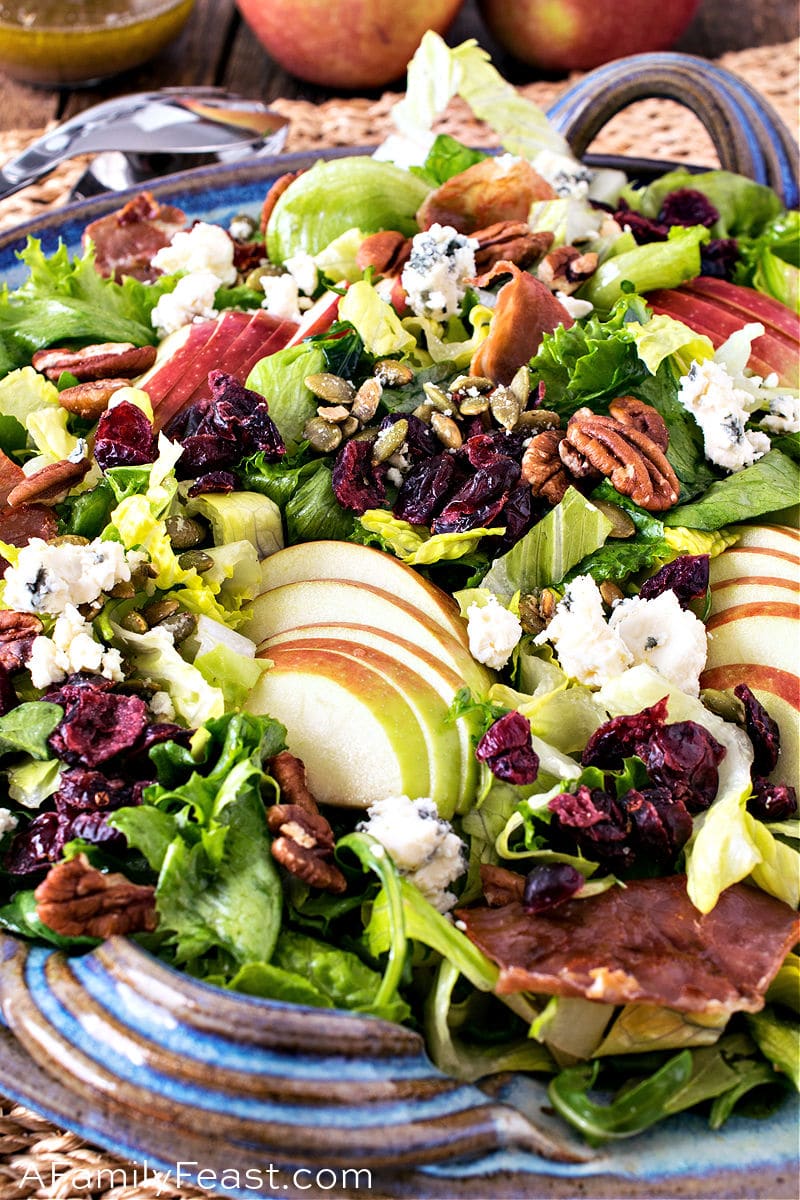 - In a large bowl, place arugula and mixed greens and toss with two tablespoons of the dressing, just enough to coat. Pour out onto your serving platter or large bowl and top with the toasted pumpkin seeds, toasted pecan halves, crispy prosciutto, sliced apple halves, dried cranberries and crumbled Gorgonzola cheese.