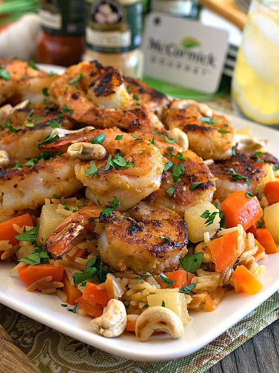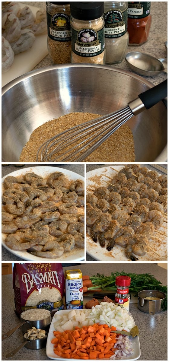 This month’s challenge asked for a recipe using McCormick Gourmet California Garlic Powder, chicken stock, rice and the root vegetable(s) of our choice – ingredients that we cook with all the time! We decided to make some delicious grilled garlic lemon shrimp that was seasoned with a wonderful spice mix made with the California Garlic Powder as well as McCormick Gourmet Collection Lemon Peel