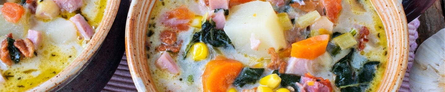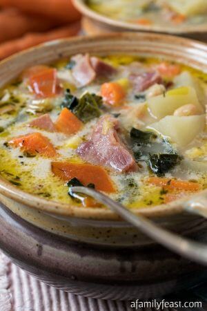 Smoky ham and tender vegetables in a creamy broth. This soup is fantastic!