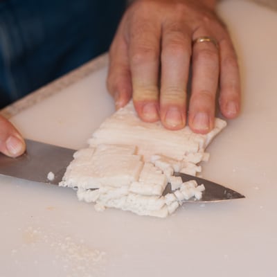 With a sharp chef’s knife, make horizontal and vertical slices into the salt pork, cutting all the way down to the tough skin without cutting through it. The results should be a patchwork of cuts.