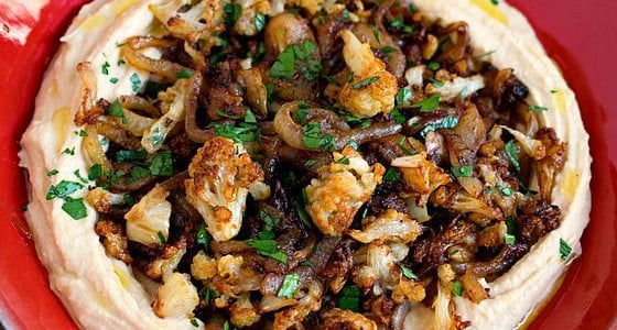 - To serve, spoon the prepared hummus into a wide bowl and spoon the cauliflower and onion mixture over the top. Garnish with chopped parsley and a generous drizzle of olive oil.