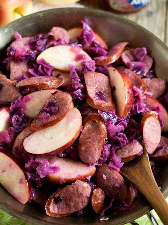 Kielbasa and Red Cabbage Skillet with Apples has tender cooked cabbage, zesty kielbasa and sweet apple slices in this family-friendly meal!