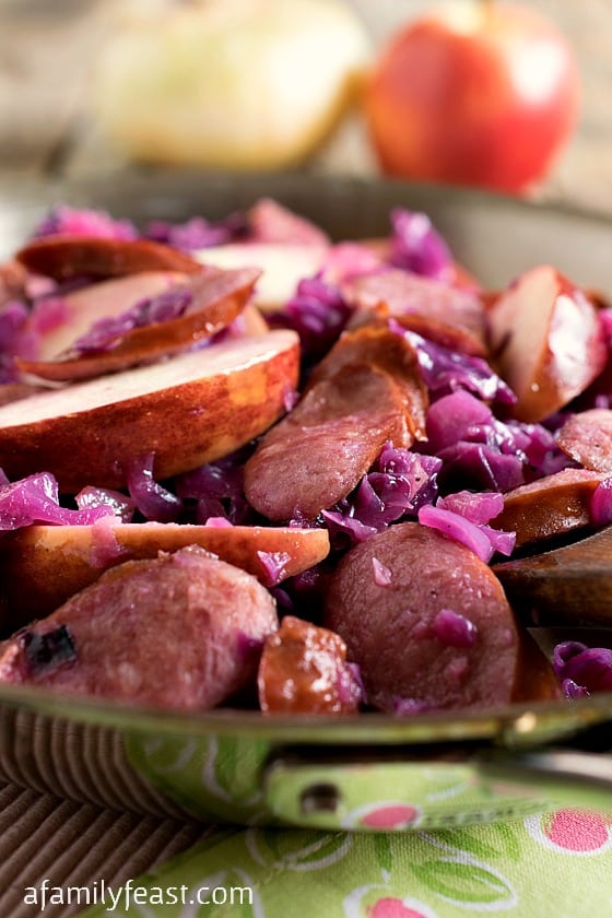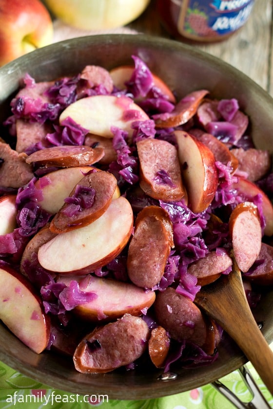 You’ll start by sautéing some onion in a large skillet (you want to use one with a lid) – then add in chopped red cabbage, apple juice, and diced apple along with some vinegar, sugar and seasonings. All of this quickly cooks until tender. Then you’ll add in sliced kielbasa and cook that until heated through.