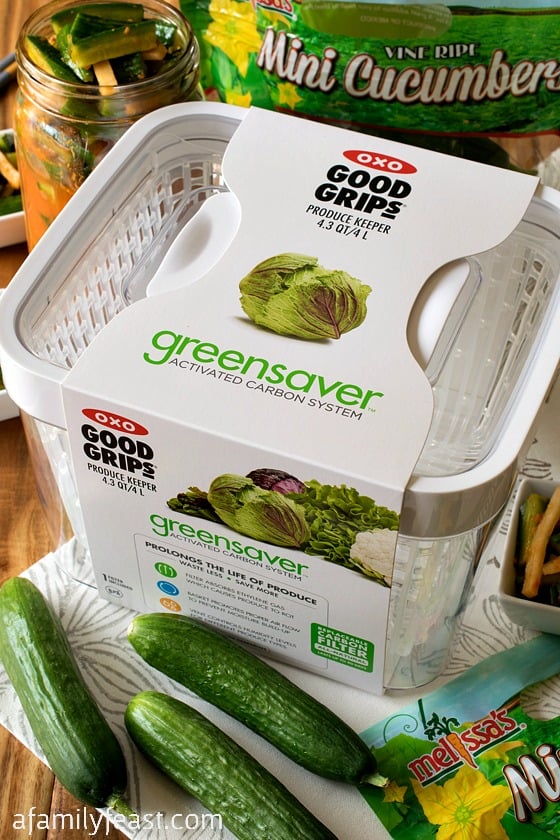 But as the way things go sometimes – our week got crazy busy – and Jack didn’t have a chance to prepare his Korean-Style Marinated Cucumbers for a few days. But thankfully, we also received an OXO GreenSaver Produce Keeper to try out, and we were able to keep those wonderful cucumbers fresh and crisp until he could develop the recipe!