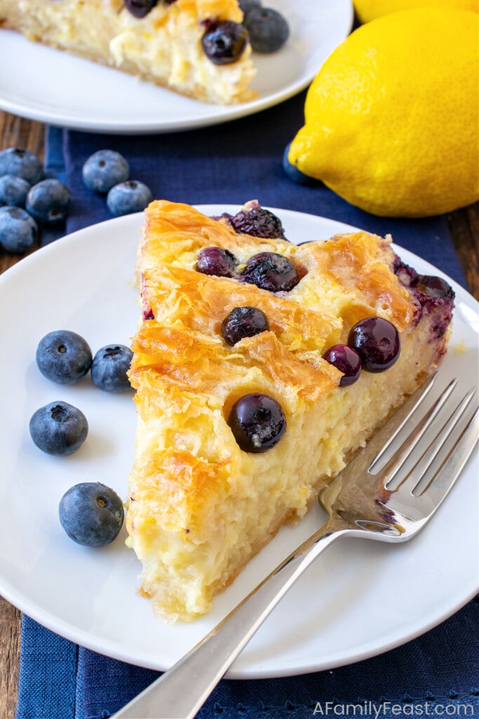Each slice of our Lemon Blueberry Soufra is pure heaven! The custard seeps down into each fold of the phyllo dough so the inside is sweet, soft, and tender while the top stays a little crispy. The fresh blueberries add pops of bright fresh fruity flavor in every bite.
