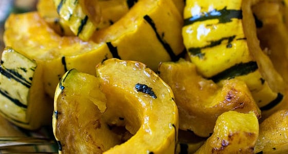 We have found that the best method to cook this wonderful squash is to cut them in half, remove the seeds and slice them – then simply roast it with oil and salt. Once they are out of the oven, we love to toss it in a delicious, warm maple sage dressing made from maple syrup and fresh sage. Or – you can simply eat the Roasted Delicata Squash as they are – caramelized and without a dressing – right from the oven!
