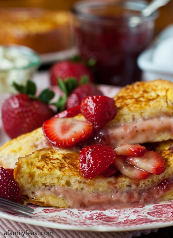 Thick slices of challah or white bread are stuffed with a creamy mixture of mascarpone cheese and strawberry preserves. Next, the slices are dipped in an egg-milk mixture, then cooked on a griddle until perfectly golden brown on the outside, and warm on the inside!