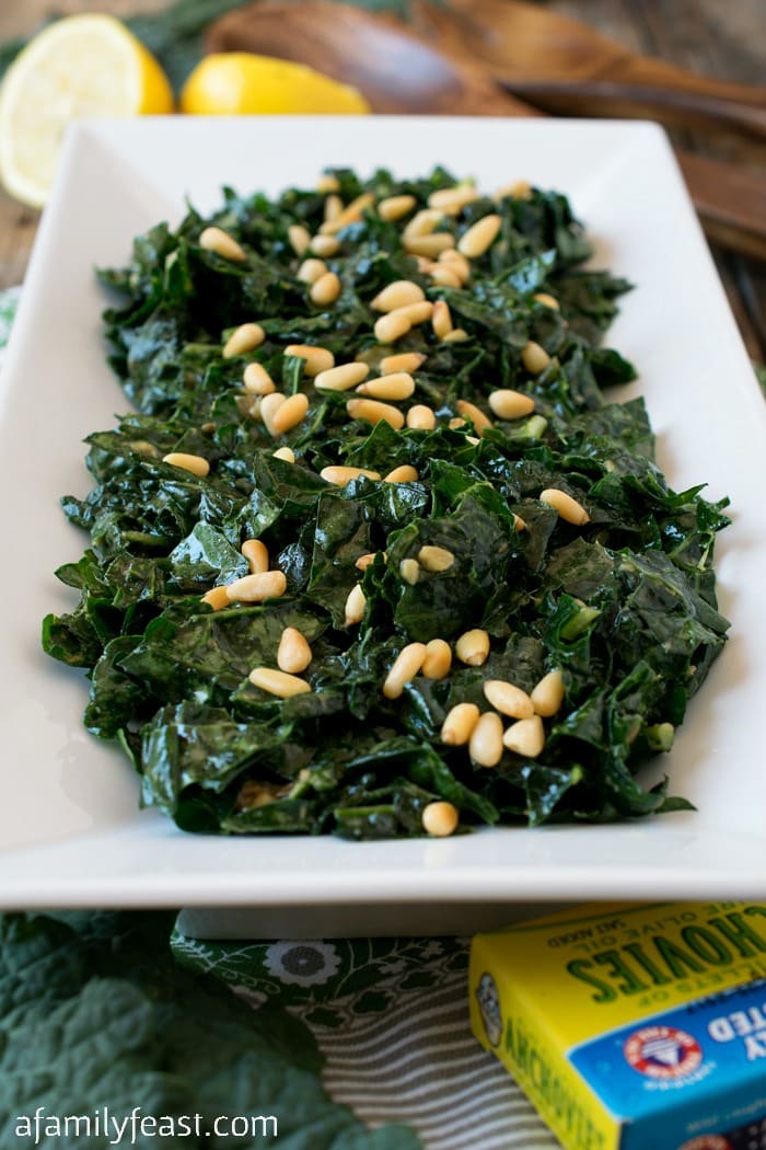 Massaged Kale with Lemon and Pine Nuts is an easy and flavorful way to prepare Tuscan kale. The kale is massaged in oil, garlic and anchovies until tender.