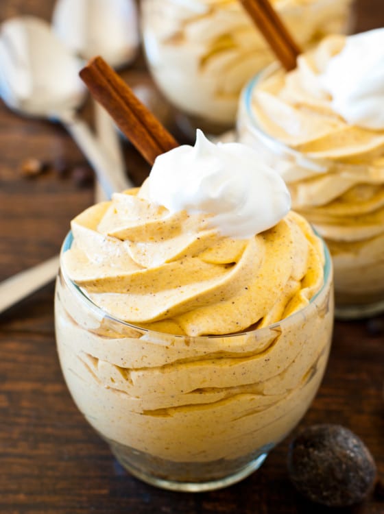 P.S. We get asked a lot of questions about those cute little serving glasses in the photos above. The exact glasses we used are no longer available, but you could serve them in clear glass votive candle holders like this. Or, if you are taking these mini desserts to another home, small plastic cups like this or even this are another great option. Then decorate with a dollop of whipped cream on top, and a cinnamon stick for garnish.