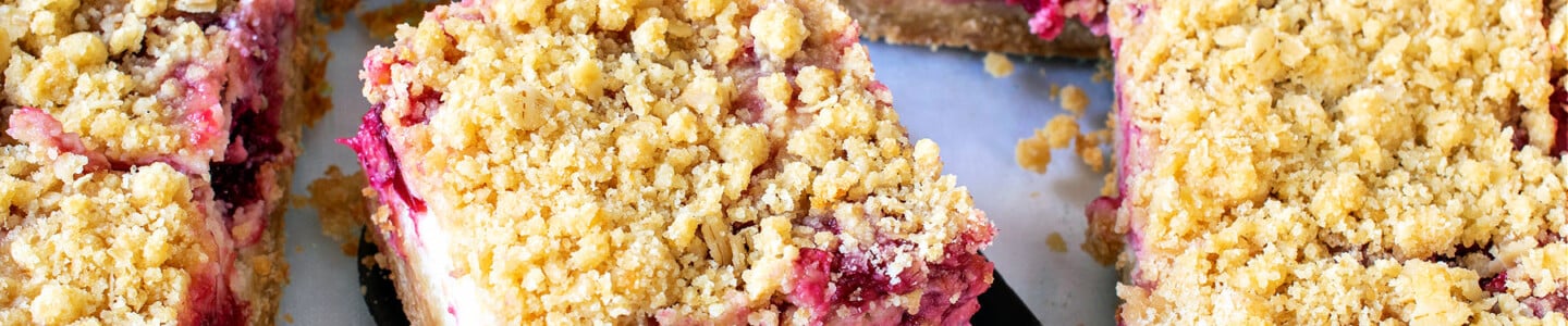 - When the crust is done baking, remove from the oven and pour the cream cheese mixture evenly over the crust. Then spoon the cranberry mixture evenly over the cream cheese mixture, spreading gently with the back of a spoon so that it is evenly coated. Then sprinkle the reserved oatmeal crumbs over the top of the cranberry mixture.