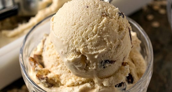 according to your manufacturer’s instructions. A few minutes before the ice cream is done churning, add in the raisins (pour in all liquid as well) and the crumbled oatmeal praline. Freeze another 2 to 4 hours before serving.