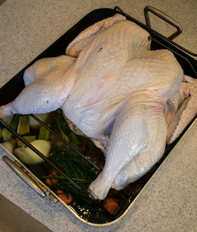 Our method of roasting is also a little bit unconventional in that we remove the back bone from the turkey before roasting! The turkey is laid flat over a V-shaped roasting rack – and this allows the turkey to roast more evenly in the oven, preventing the breast meat of the turkey from becoming overcooked while the legs and thighs take longer to cook. (I should also point out that roasting your turkey stuffed is NEVER recommended! By the time the stuffing inside the turkey is cooked, the meat of the turkey will be very overcooked!)