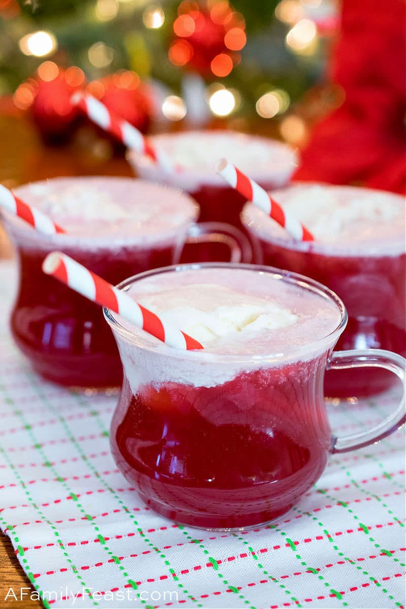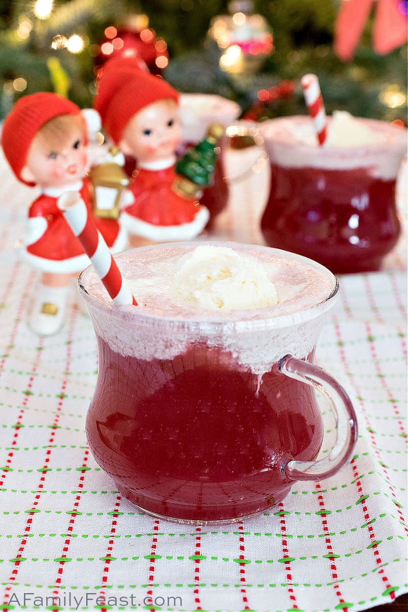 You could also serve this in a punch bowl if you’d like – mixing the juice and soda, then floating several scoops of ice cream in the bowl to scoop out for each serving. If you decide to do this, we’d suggest freezing some of the pomegranate juice in ice cube trays, then adding those to the juice mixture as it sits. (These juice ice cubes will keep the drinks cold and will avoid diluting.)
