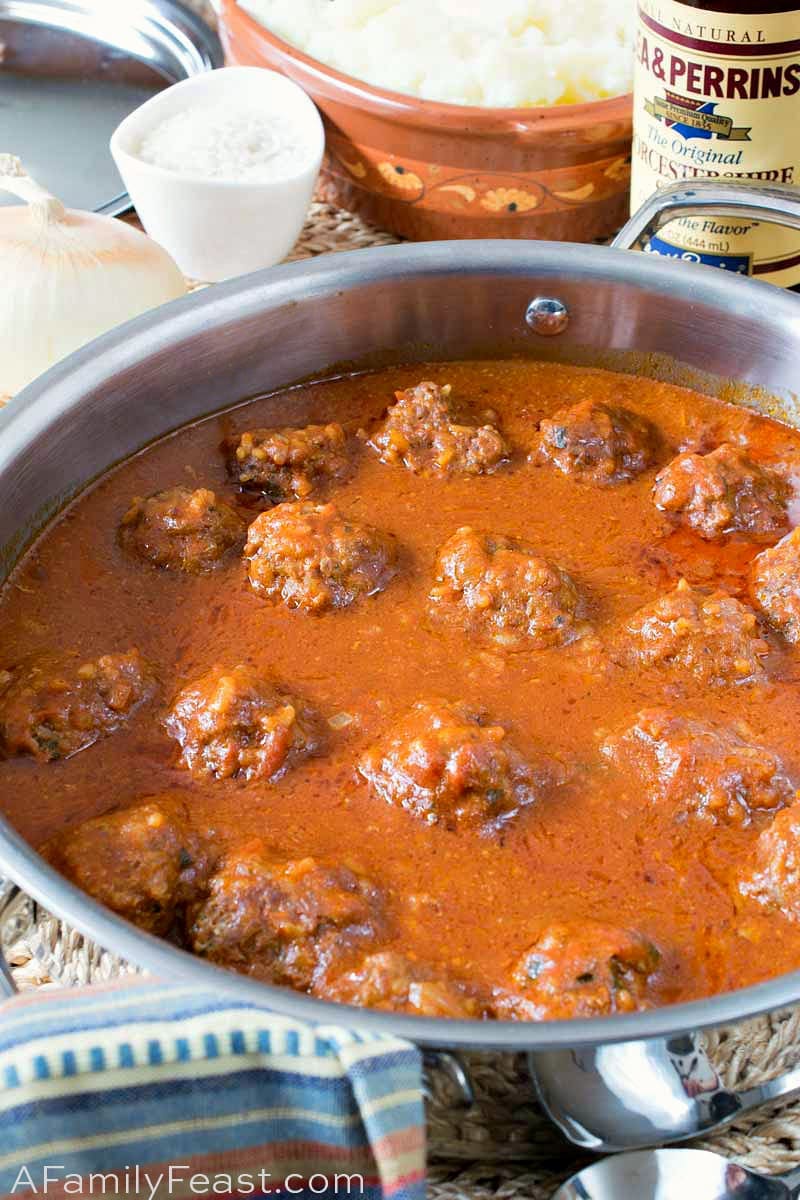 Ground beef and white rice are combined and formed into meatballs. The meatballs are then cooked in a rich tomato sauce that’s flavored with Worcestershire Sauce – then served over mashed potatoes.