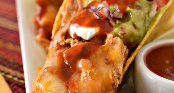 One of the most popular recipes on our site is our recipe for Mexican Pulled Chicken – and that recipe is terrific used as a filling for tacos. Just load up your favorite taco shell (we used store-bought, hard corn taco shells here, but soft tacos are also delicious) with the pulled chicken and your choice of toppings.