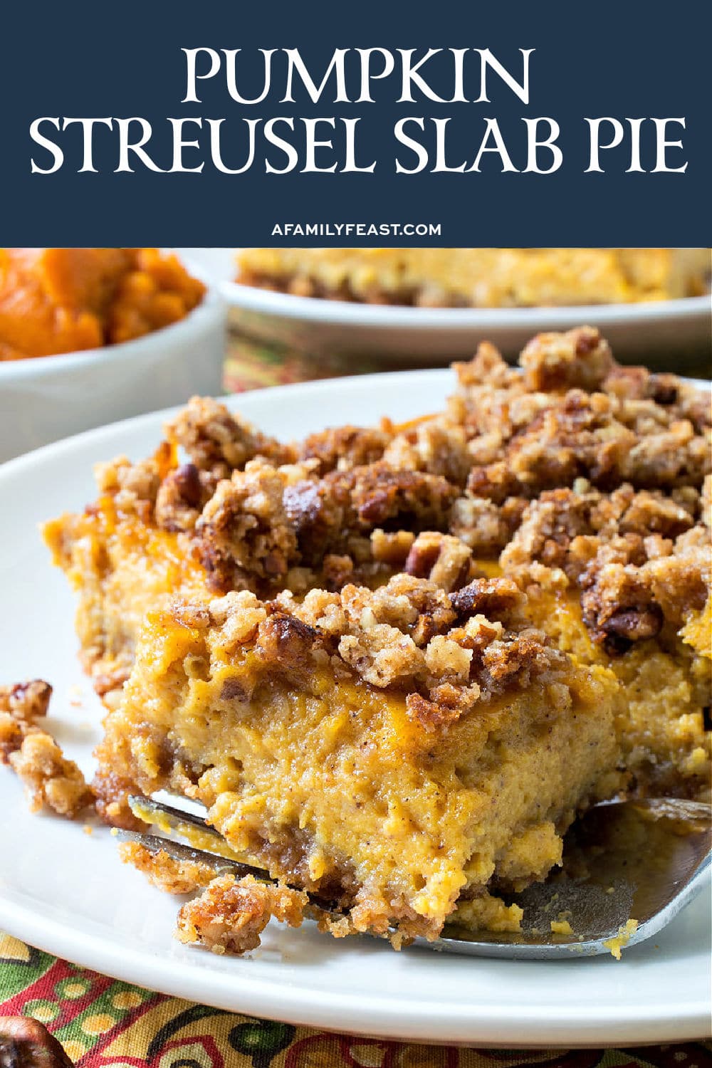 Pumpkin Streusel Slab Pie has all of the same delicious flavors of a traditional pumpkin pie but served in squares. A graham cracker crust and a nutty streusel topping really sweeten this delicious deal!