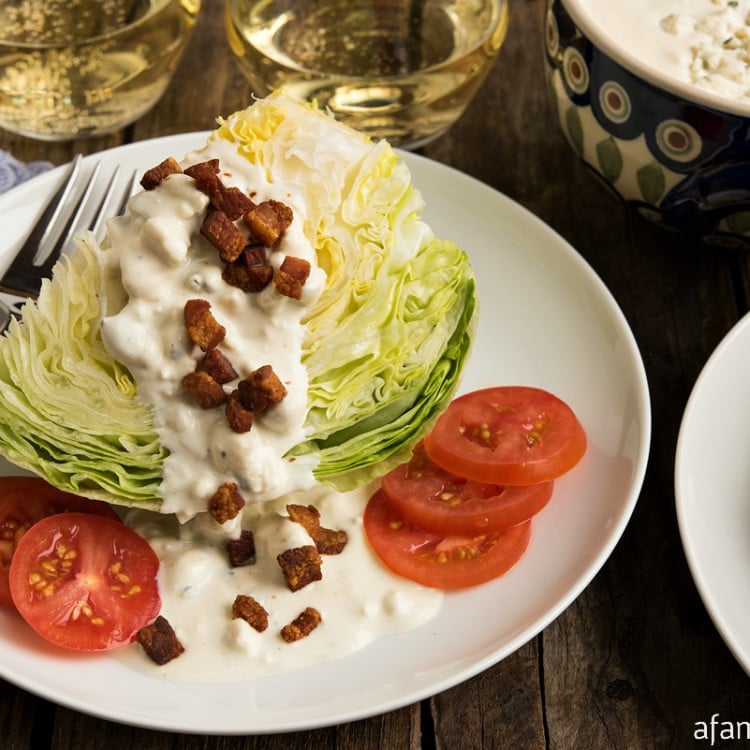 What makes this salad so good is just simple, quality ingredients: A chilled wedge of crisp, fresh iceberg lettuce, a generous amount of rich and creamy blue cheese dressing, juicy, ripe tomato slices, plus a sprinkle of crispy pancetta. Nothing overly fancy – just the perfect combination of flavors and textures!