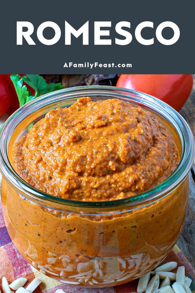Romesco Sauce combines roasted tomatoes, garlic, red peppers and chiles, almonds, and toasted bread, with herbs, spices, olive oil, and a splash of vinegar. This combination of ingredients creates an incredibly delicious sauce for seafood, pasta, vegetables, poultry, and other meats.