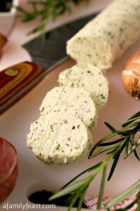 Rosemary Compound Butter combines minced fresh rosemary, shallots, and seasonings with unsalted butter. Roll then slice for serving and use in recipes.