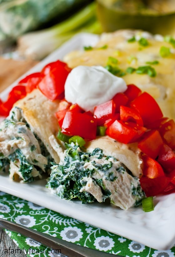 As two people who both love to cook, my husband Jack and I came into our relationship each with our own recipes for certain foods. Jack’s recipe for Chicken Enchiladas with White Sauce is among our most popular recipes on A Family Feast – and for very good reason – it’s delicious! But sometimes, lighter and lower-calorie fare is in order (food blogging can be very hard on the waist line…) – and that’s where my recipe for Skinny Creamy Chicken Enchiladas comes in!