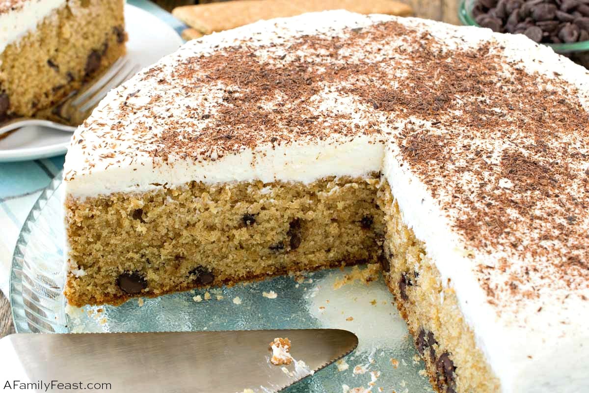 A S’mores Cake is a chocolate chip graham cracker cake, topped with a marshmallow buttercream frosting.