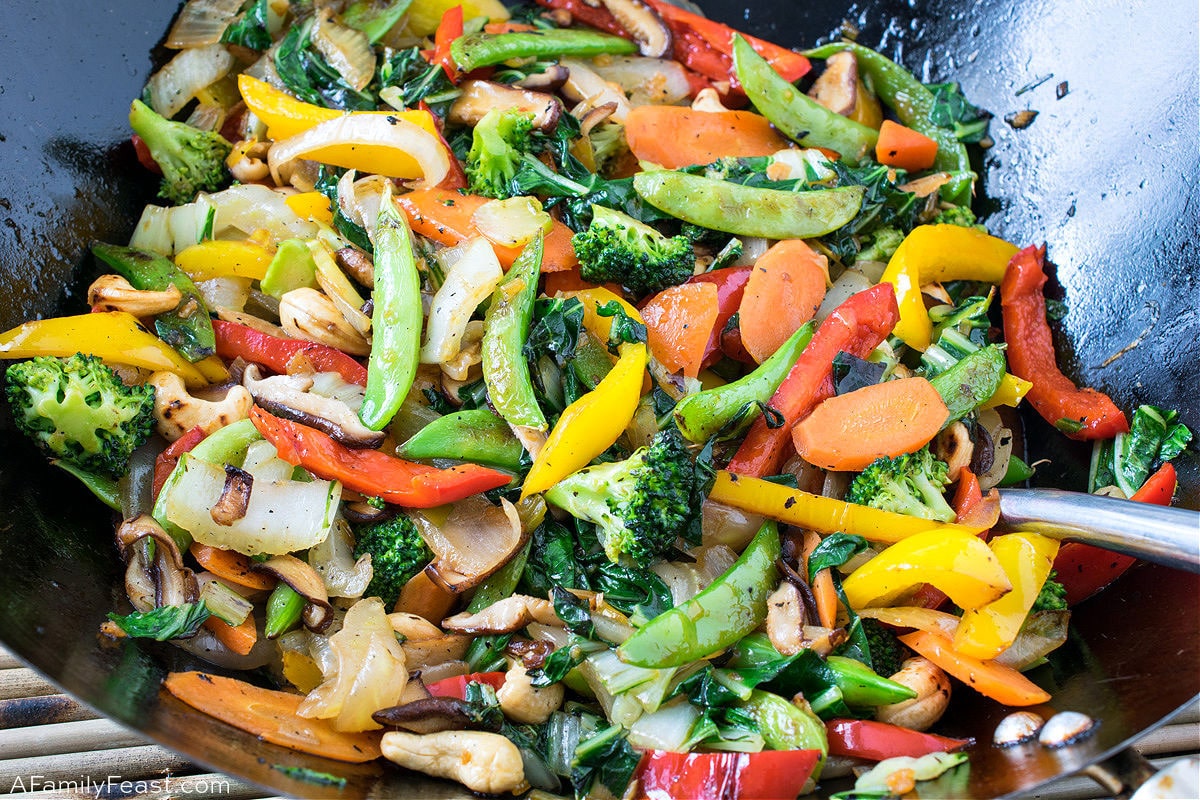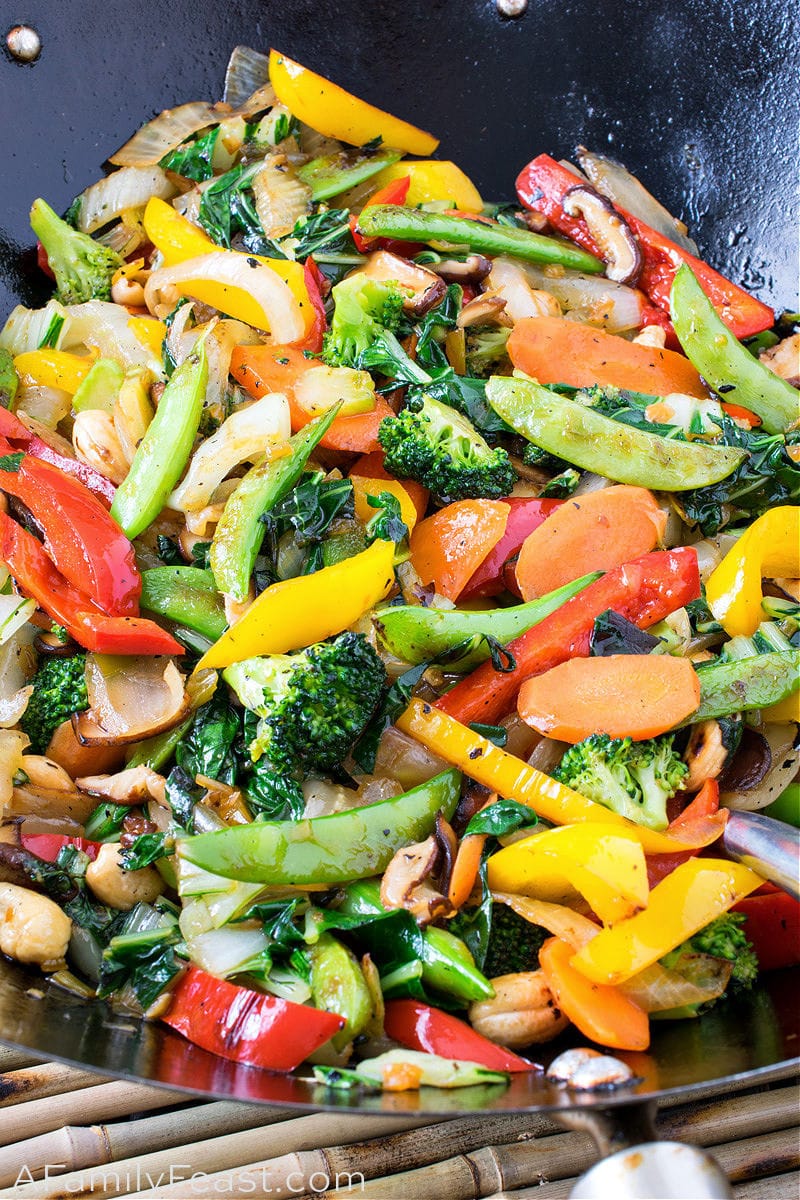 The key to perfect stir fry vegetables is to cook the veggies in separate batches – because some vegetables cook faster than others. (When you cook each vegetable separately, you won’t have some soggy and overcooked and others underdone and too crunchy.) Then, combine the cooked vegetables together, and toss in a flavorful sauce just before serving.
