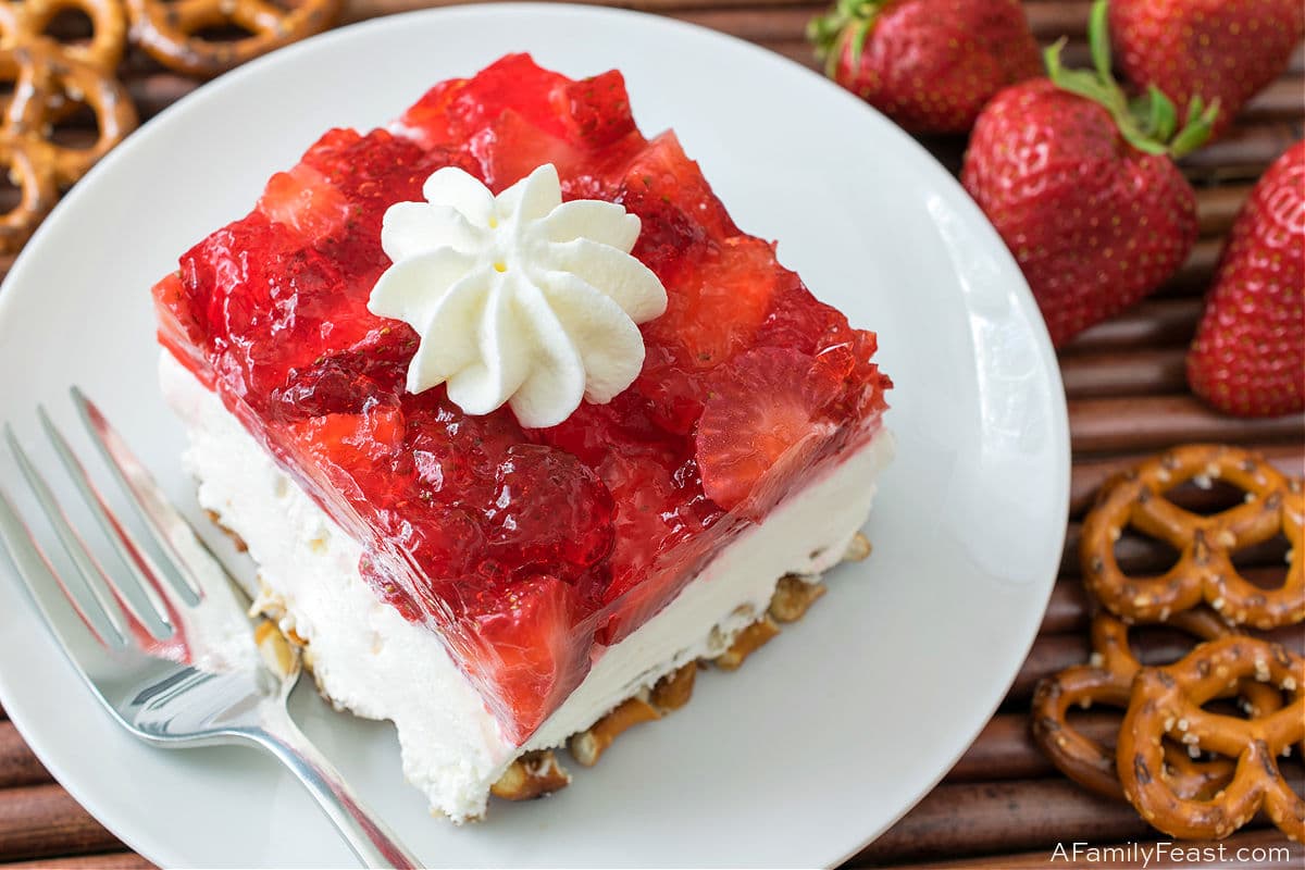 Sometimes also called a “strawberry pretzel dessert” this is a creamy, sweet layered salad or dessert comprised of a pretzel base, cream cheese-Cool Whip center, and a top layer of strawberry Jell-O and sliced strawberries.