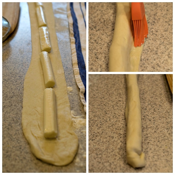 - Brush one side of the dough with water and fold the opposite side over the cheese so each edge meets. Press down or use the back of a fork to press the two sides together. (You must have a good seal.) Fold the two ends in on themselves and again, seal tightly. Then brush the top of the fold with water (where you just pinched it closed) and roll the filled dough onto the fold so you end up with the seam side down. Repeat this for the other two dough balls using 12 half pieces of cheese in each. (36 total pieces cut from 18 sticks)
