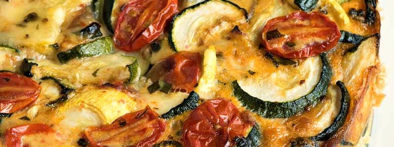 Half-round slices of zucchini are salted and roasted so that they give up some of their liquid and also lightly caramelize. Then the slices are layered in a springform pan along with sautéed red onion, fresh garden cherry or grape tomatoes, plus garlic, fresh basil and oregano. Then a creamy egg and cheese custard is poured over the vegetables – then this Summer Vegetable Torte is baked until cooked through.