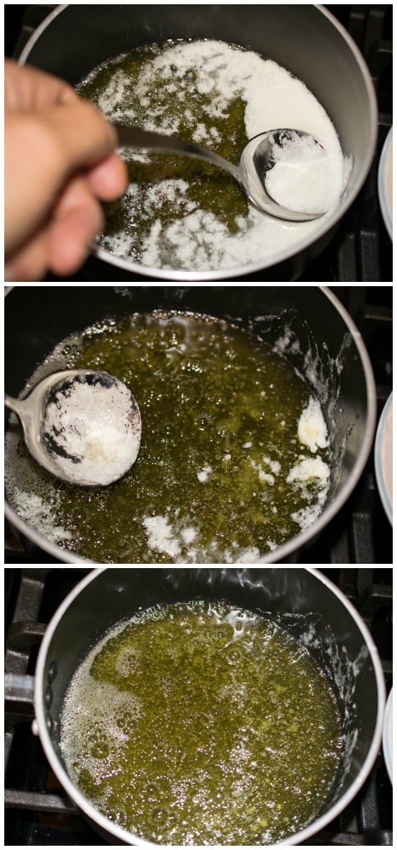 In a small to medium heavy bottomed pan, over low heat, melt butter and allow it to sit slightly bubbling for 20 minutes from the time you turn the burner on. Note that the butter will splatter and pop a bit as the milk solids separate from the milk fat.