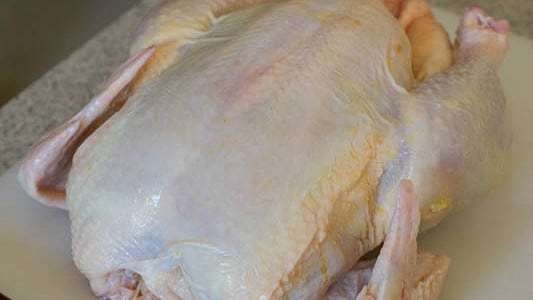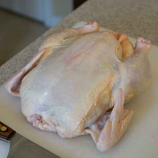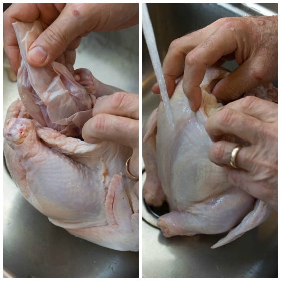 In a clean sink, remove wrapper and discard. Pull neck and gizzards from bird and remove neck from package. Place the neck in a gallon zip lock bag and set aside. If you have a use for the liver, heart and kidneys, refrigerate for that purpose, otherwise discard. Rinse the chicken under cold water, inside and out.
